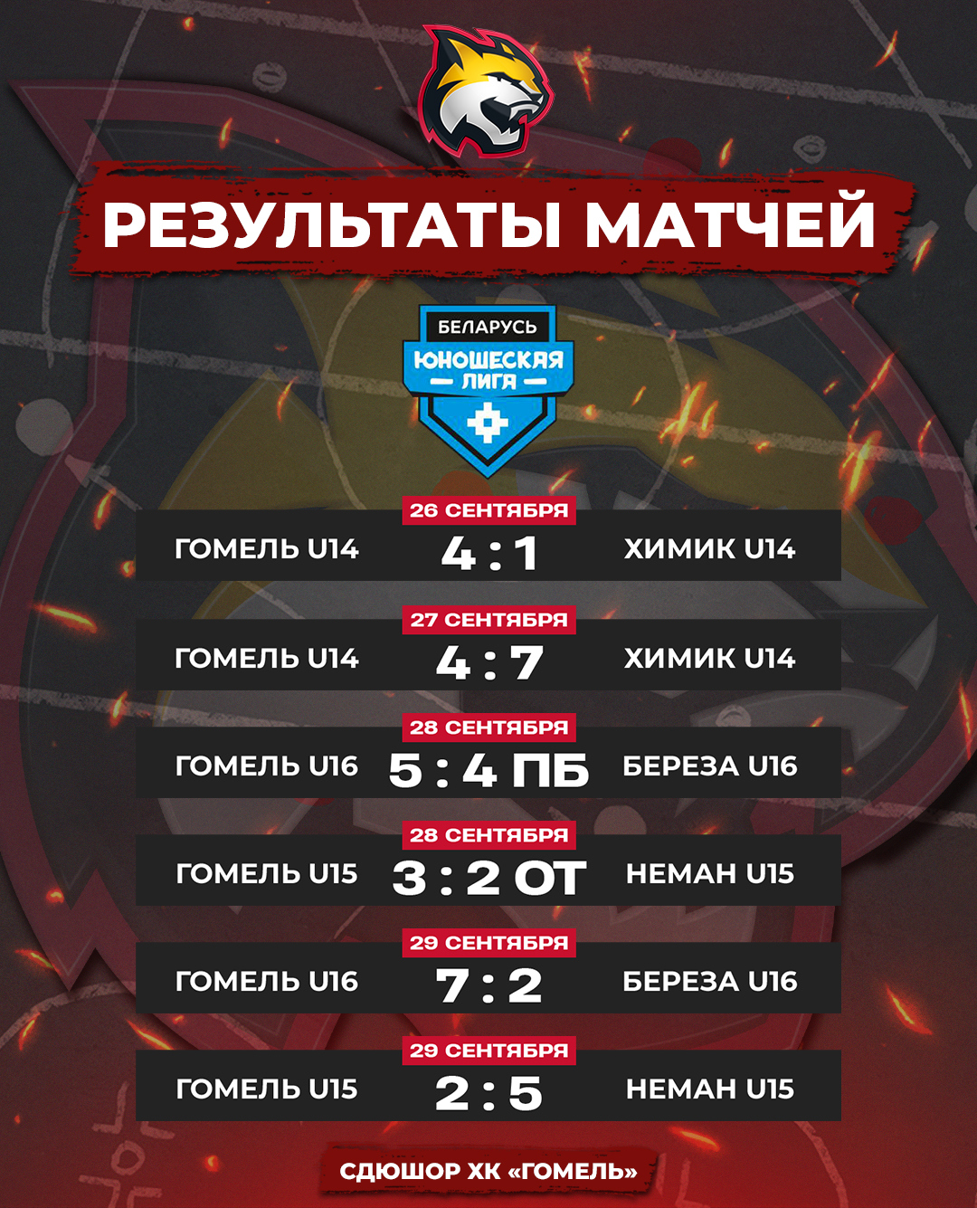 Результаты матчей команд СДЮШОР ХК «Гомель» в Юношеской лиге за 26-29 сентября