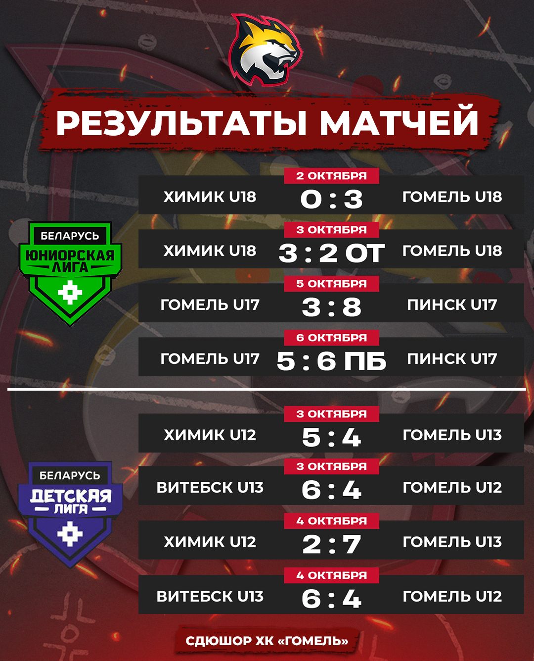 Результаты матчей команд СДЮШОР ХК «Гомель» в юниорской и детской лигах за 2-6 октября
