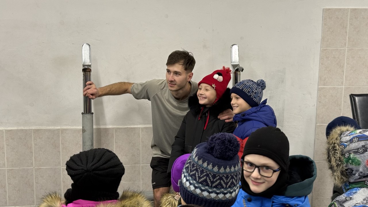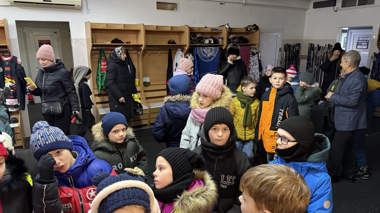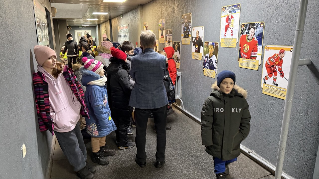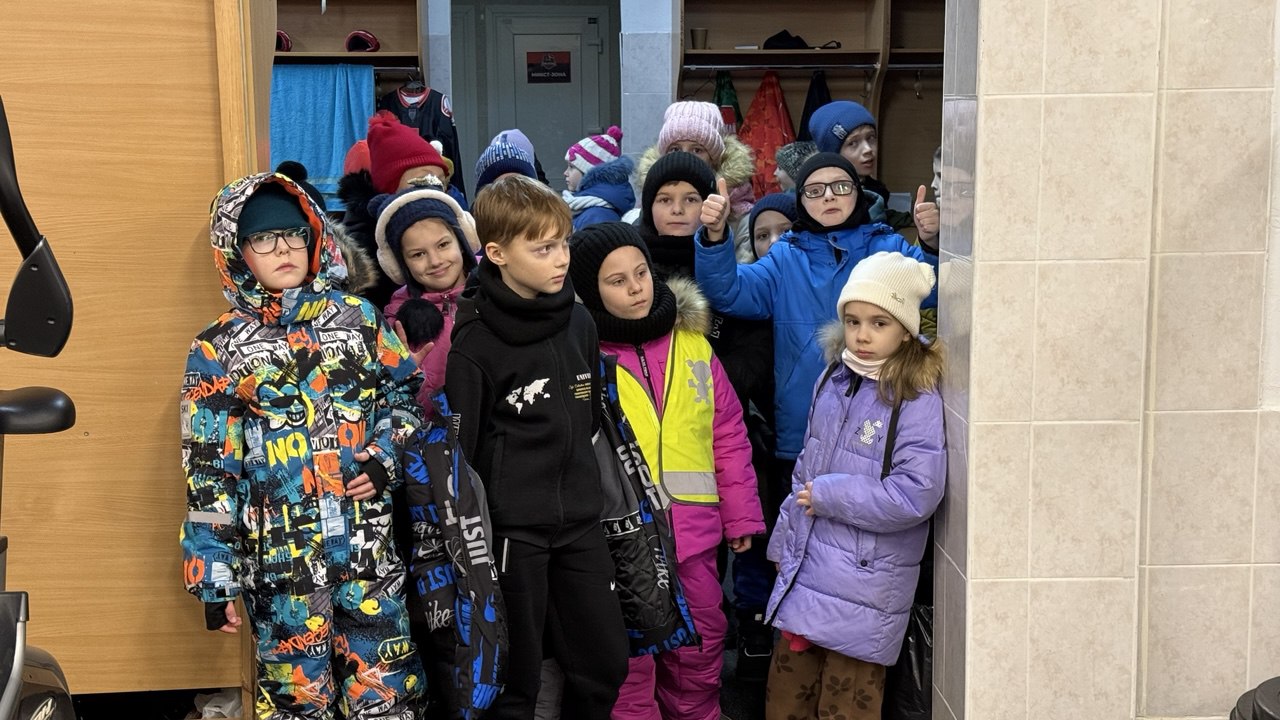 Сначала наши гости посетили обе арены дворца и понаблюдали за тренировками юных фигуристов. Далее ребята прошли через раздевалки хоккеистов, тренажерные и спортивные залы, трибуны, бросковые комнаты.