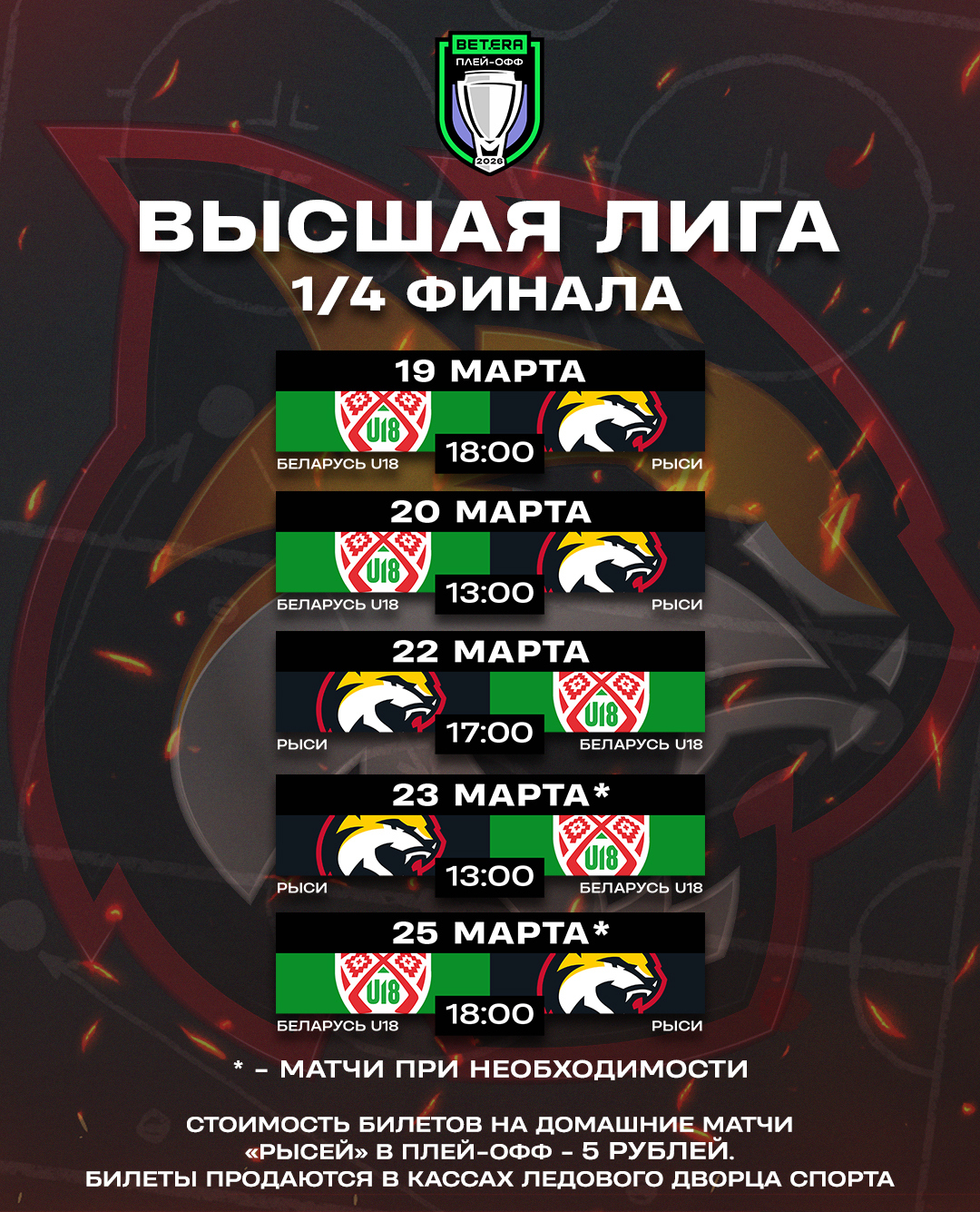 Расписание матчей «Рысей» в 1/4 финала Betera-Высшей лиги