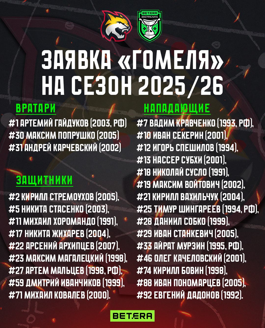 «Гомель» проведет свой первый матч в чемпионате сезона 2025/2026 уже завтра, 5 сентября. В ростере команды на данный момент находятся 27 хоккеистов (часть из них – игроки фарм-клуба «Рыси») – 3 вратаря, 9 защитников и 15 нападающих.