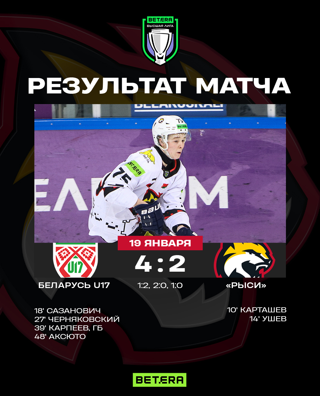 Беларусь U17 – Рыси – 4:2 (1:2, 2:0, 1:0)
