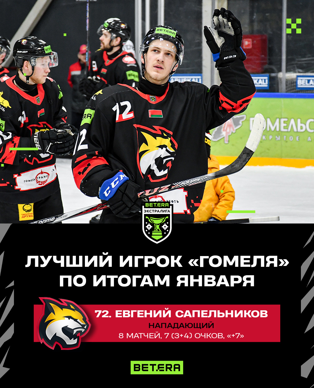 В минувшем месяце Евгений провел 8 матчей, в которых набрал 7 (3+4) результативных баллов при показателе полезности «+7» и 2 штрафных минутах.