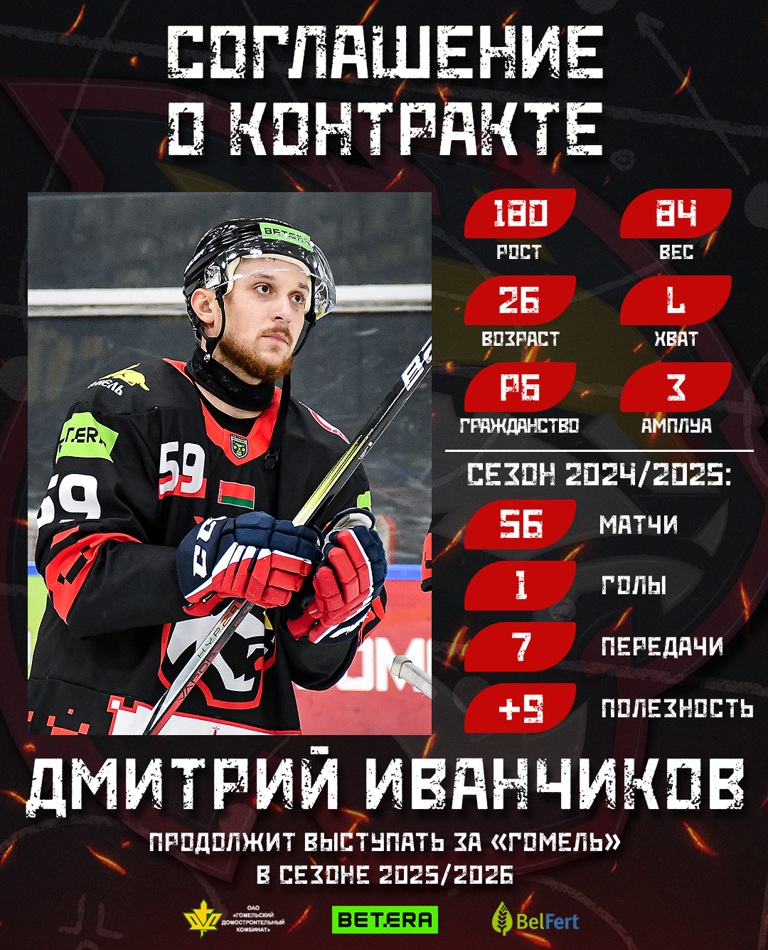 26-летний игрок обороны – воспитанник «Гомеля», в прошедшем сезоне провел 56 матчей за нашу команду с учетом плей-офф и набрал 8 (1+7) очков при показателе полезности «+9» и 10 штрафных минутах. Всего за свою карьеру в чемпионатах Беларуси Иванчиков выходил на лед в 276 поединках и отметился 42 (7+35) результативными баллами.