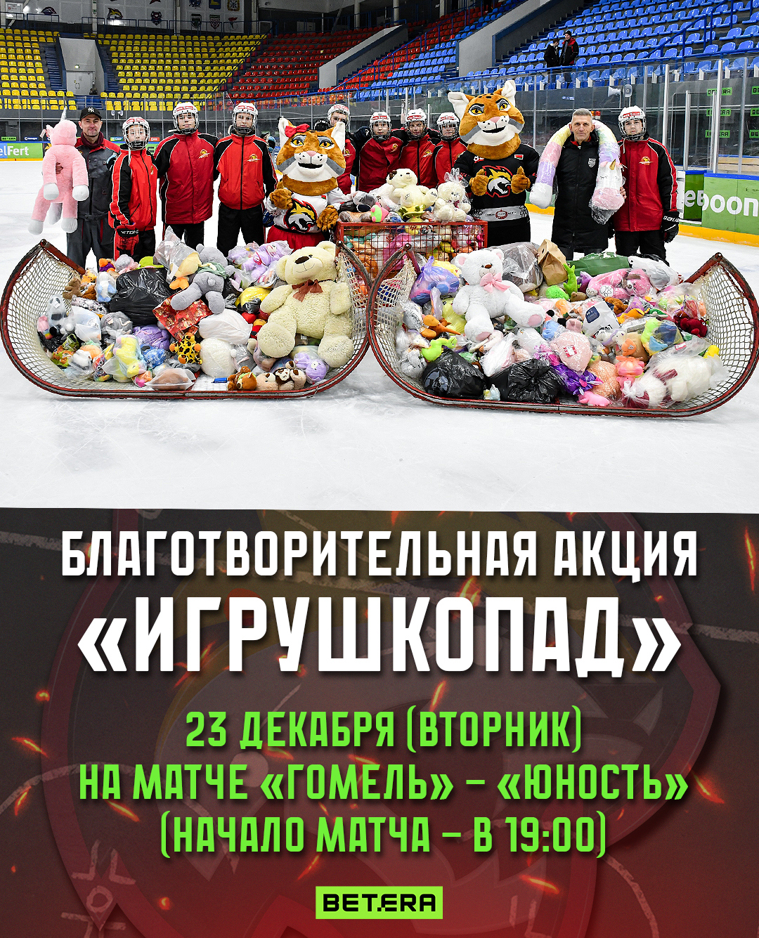 Приходите всей семьей и вместе с друзьями, принять участие в этой акции и стать частью чего-то доброго может любой желающий! Все собранные во время акции игрушки хоккейный клуб и волонтеры передадут в социальные учреждения города Гомеля.