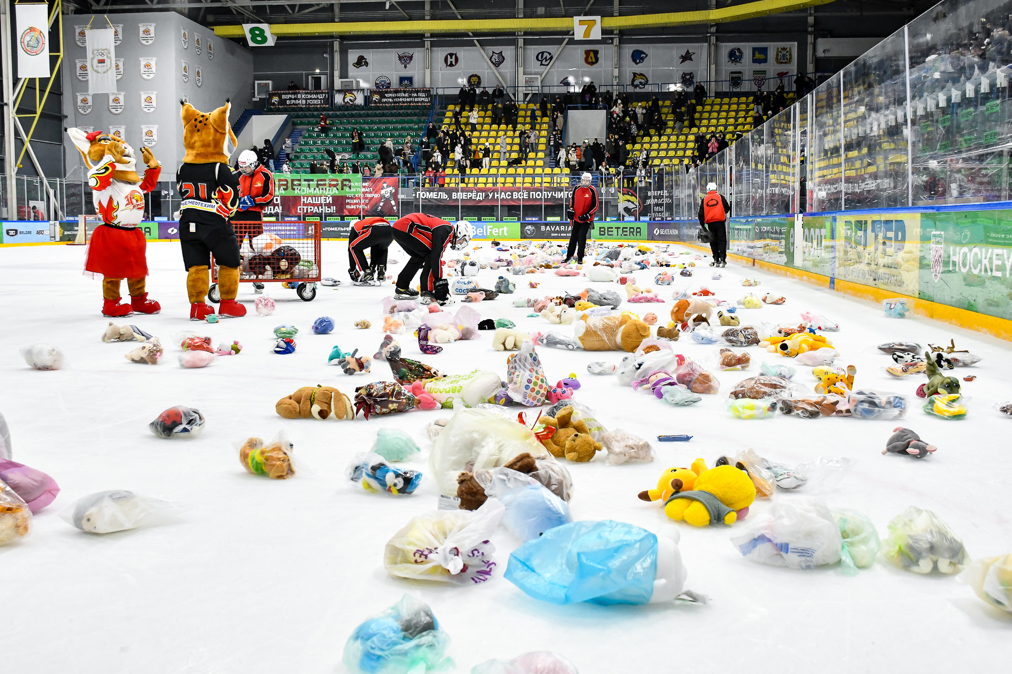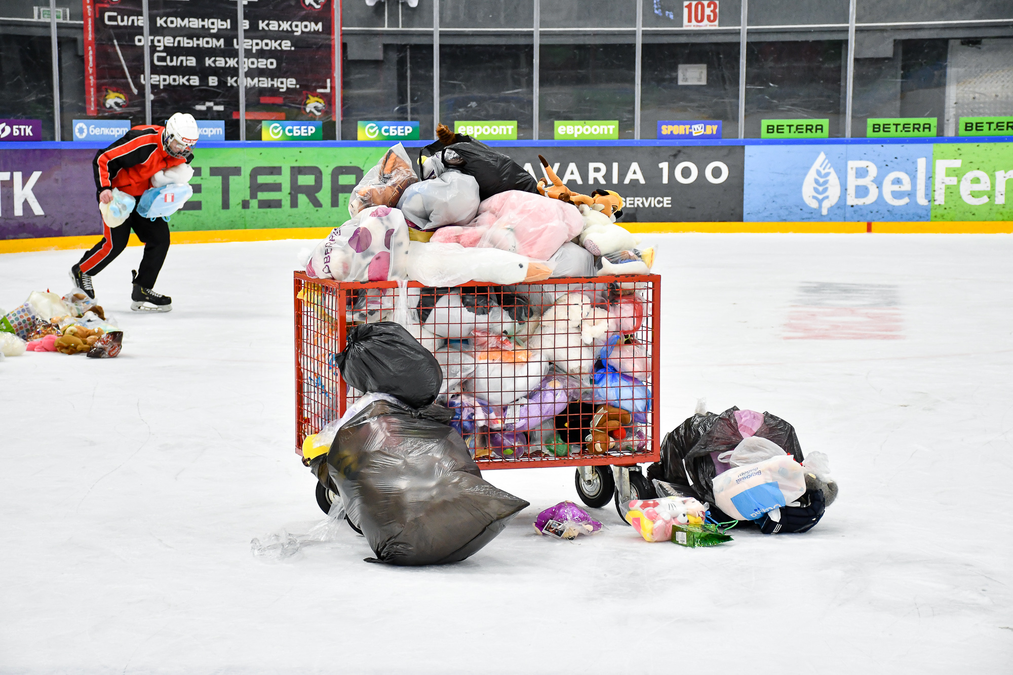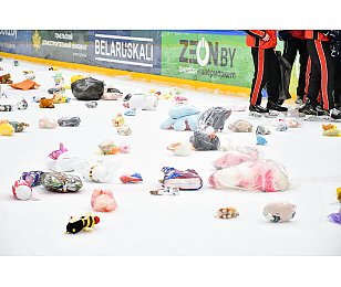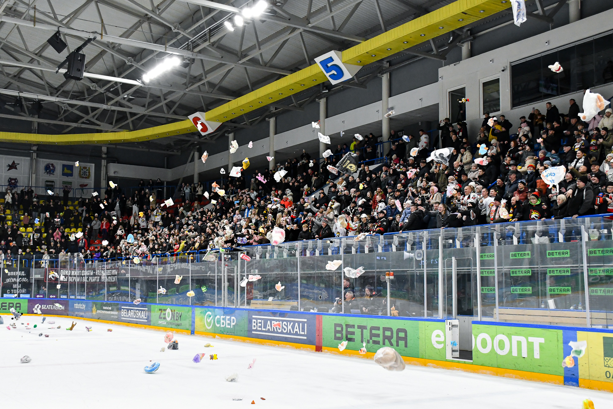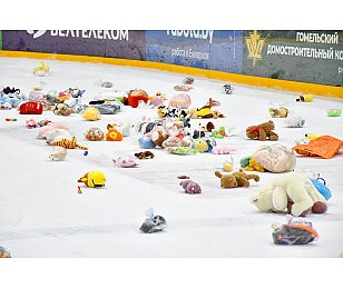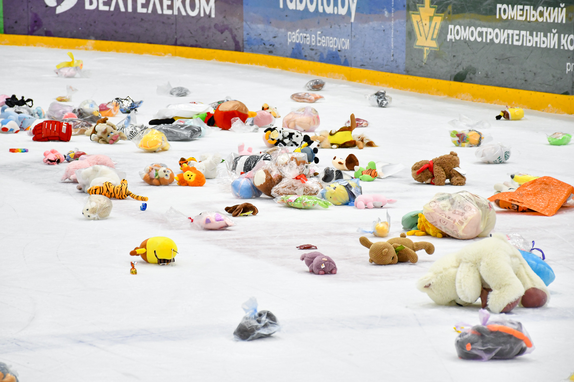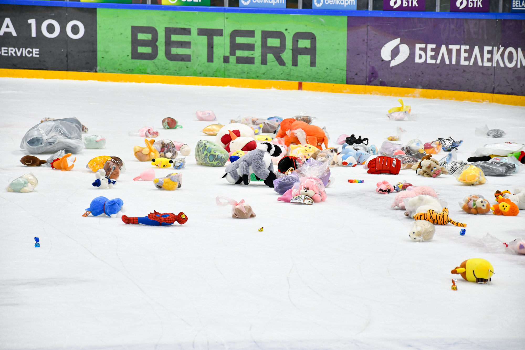 Каждый желающий, пришедший на трибуны, мог принести с собой на игру неограниченное количество мягких игрушек – от самых маленьких до самых больших. И после окончания матча по сигналу ведущего мягкие игрушки полетели на лед. К слову, вчерашний матч посетило 2500 болельщиков.