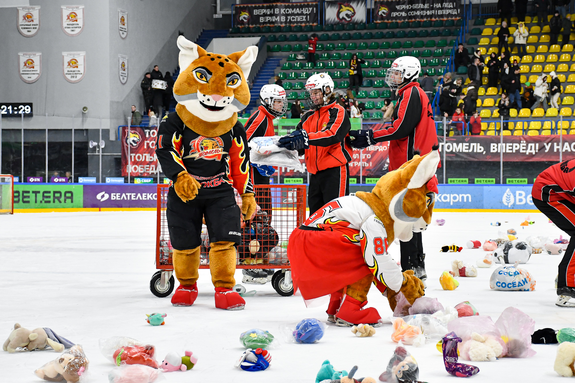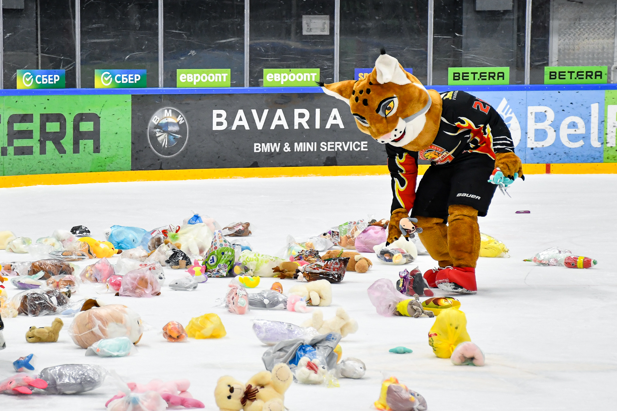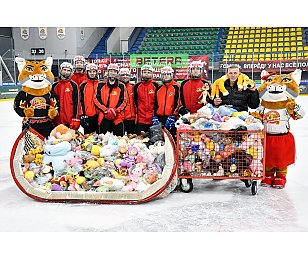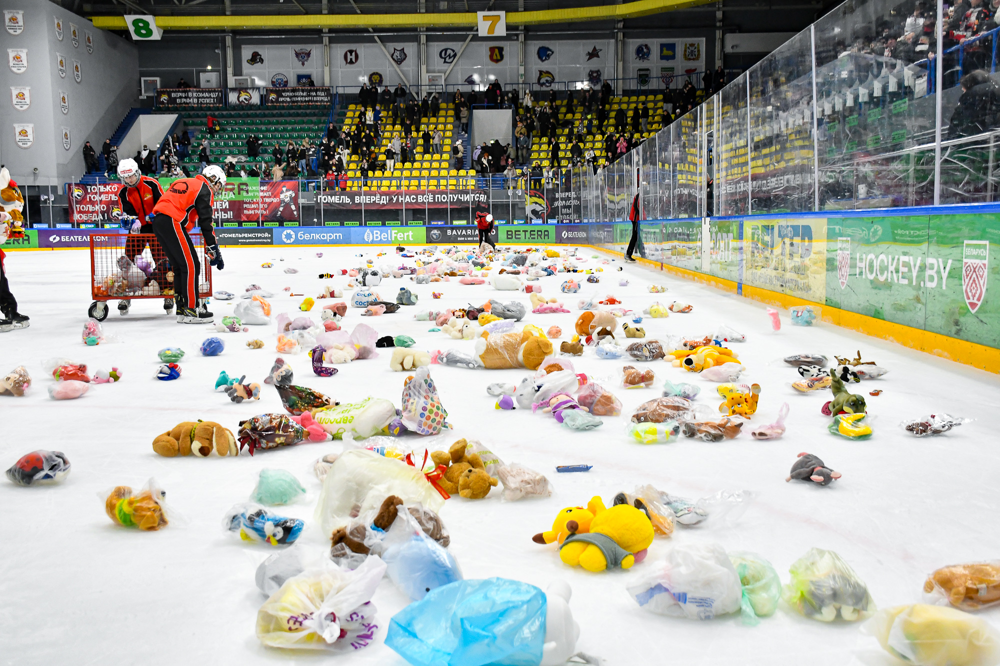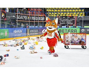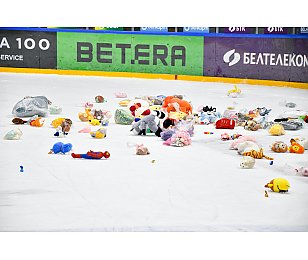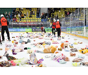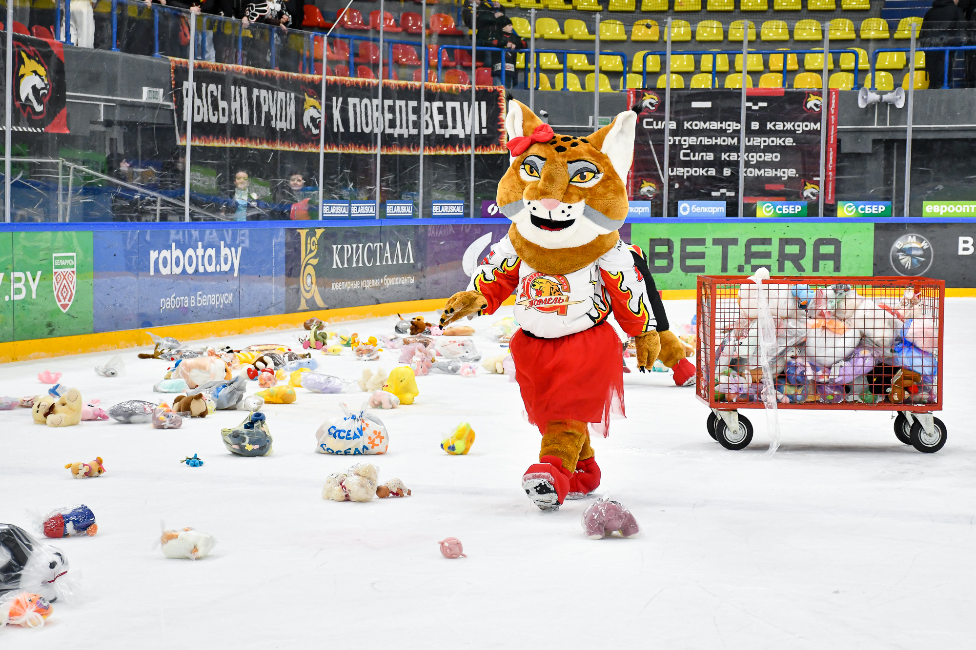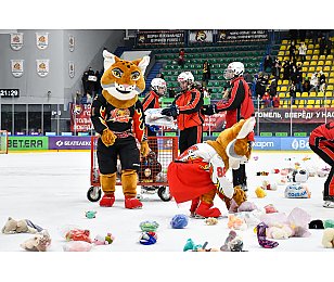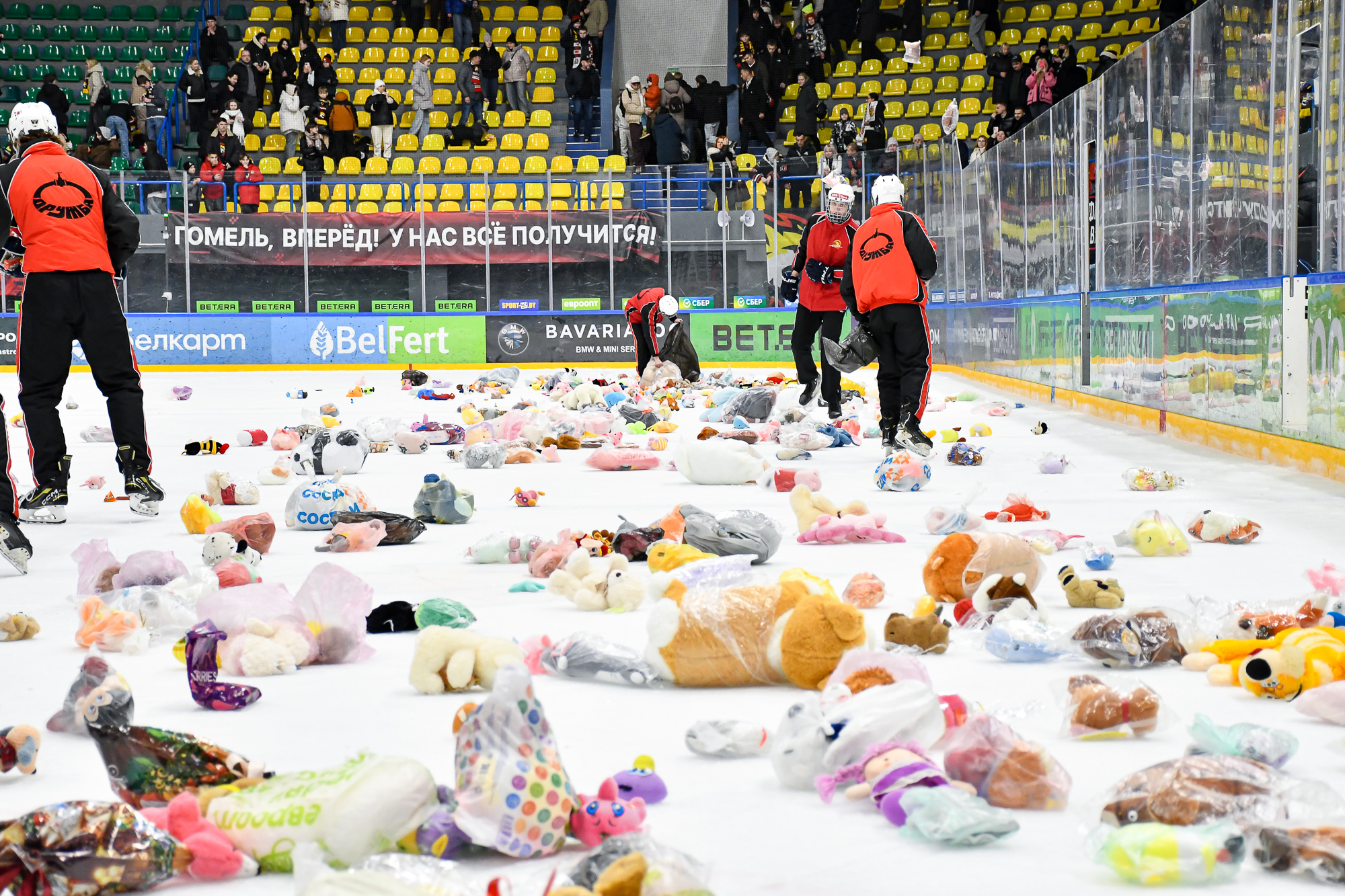 Каждый желающий, пришедший на трибуны, мог принести с собой на игру неограниченное количество мягких игрушек – от самых маленьких до самых больших. И после окончания матча по сигналу ведущего мягкие игрушки полетели на лед. К слову, вчерашний матч посетило 2500 болельщиков.