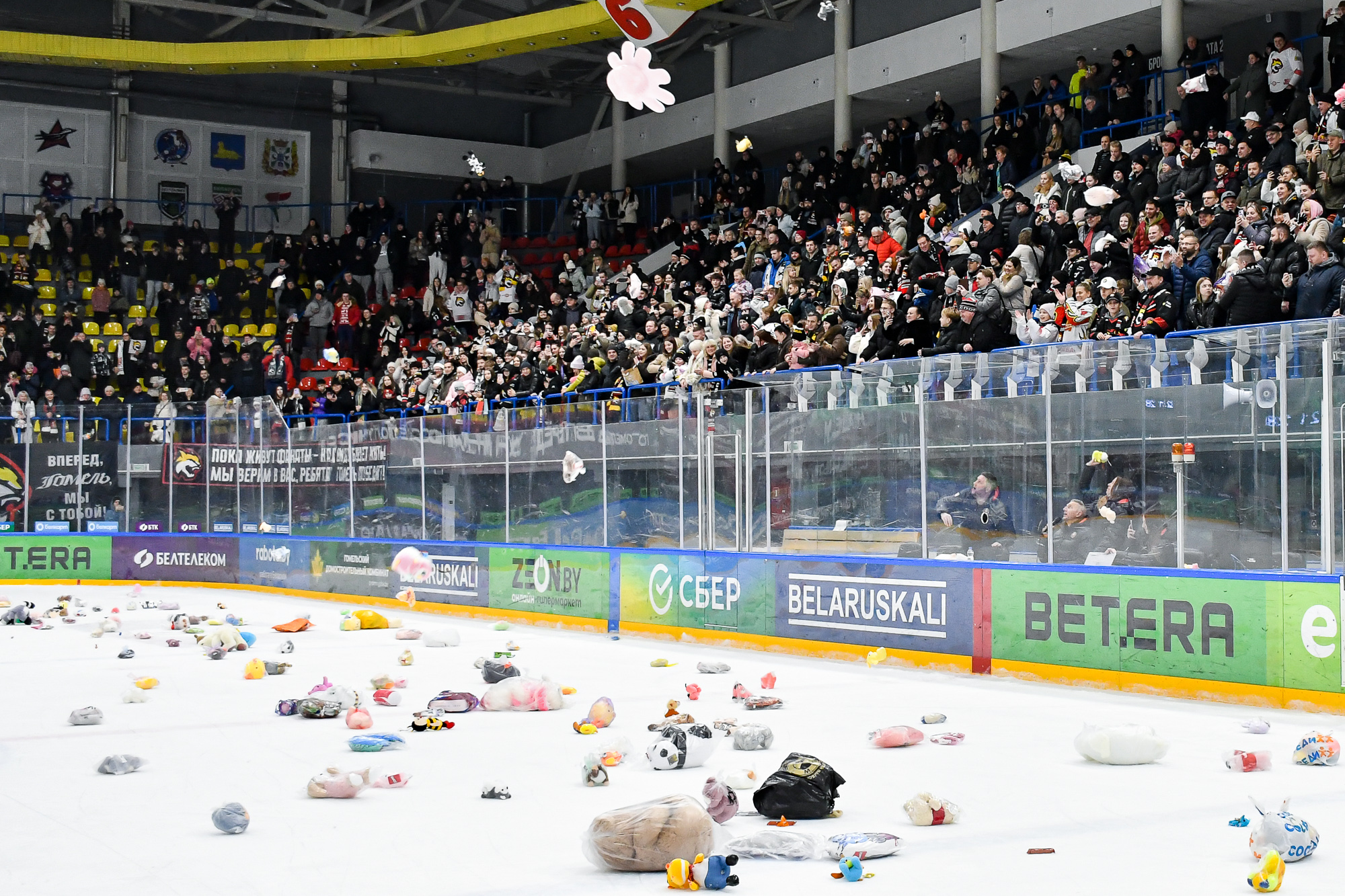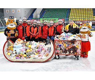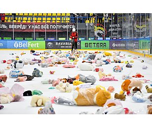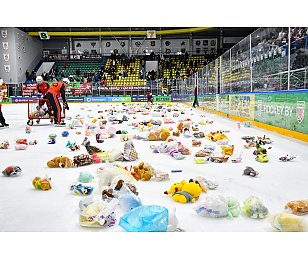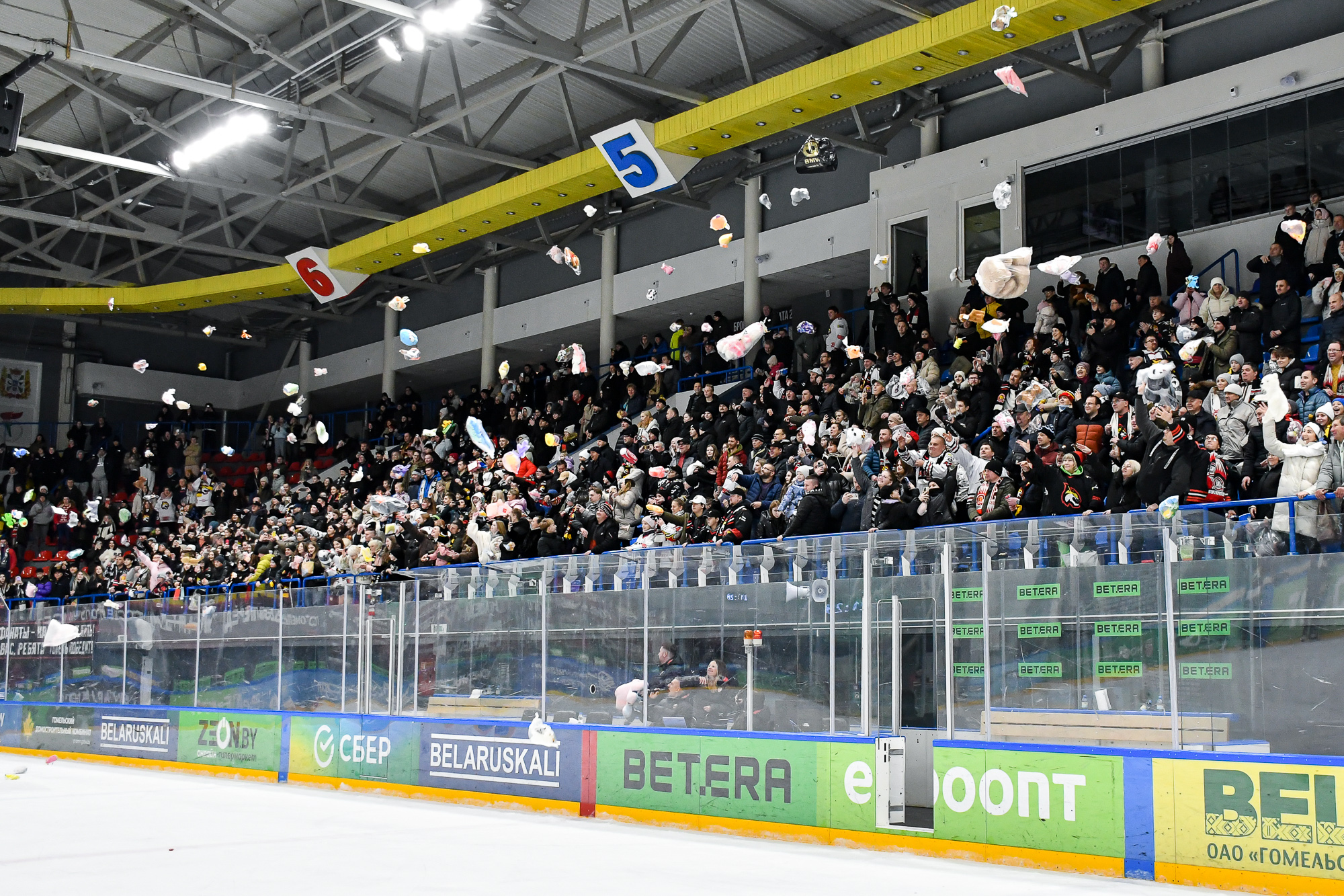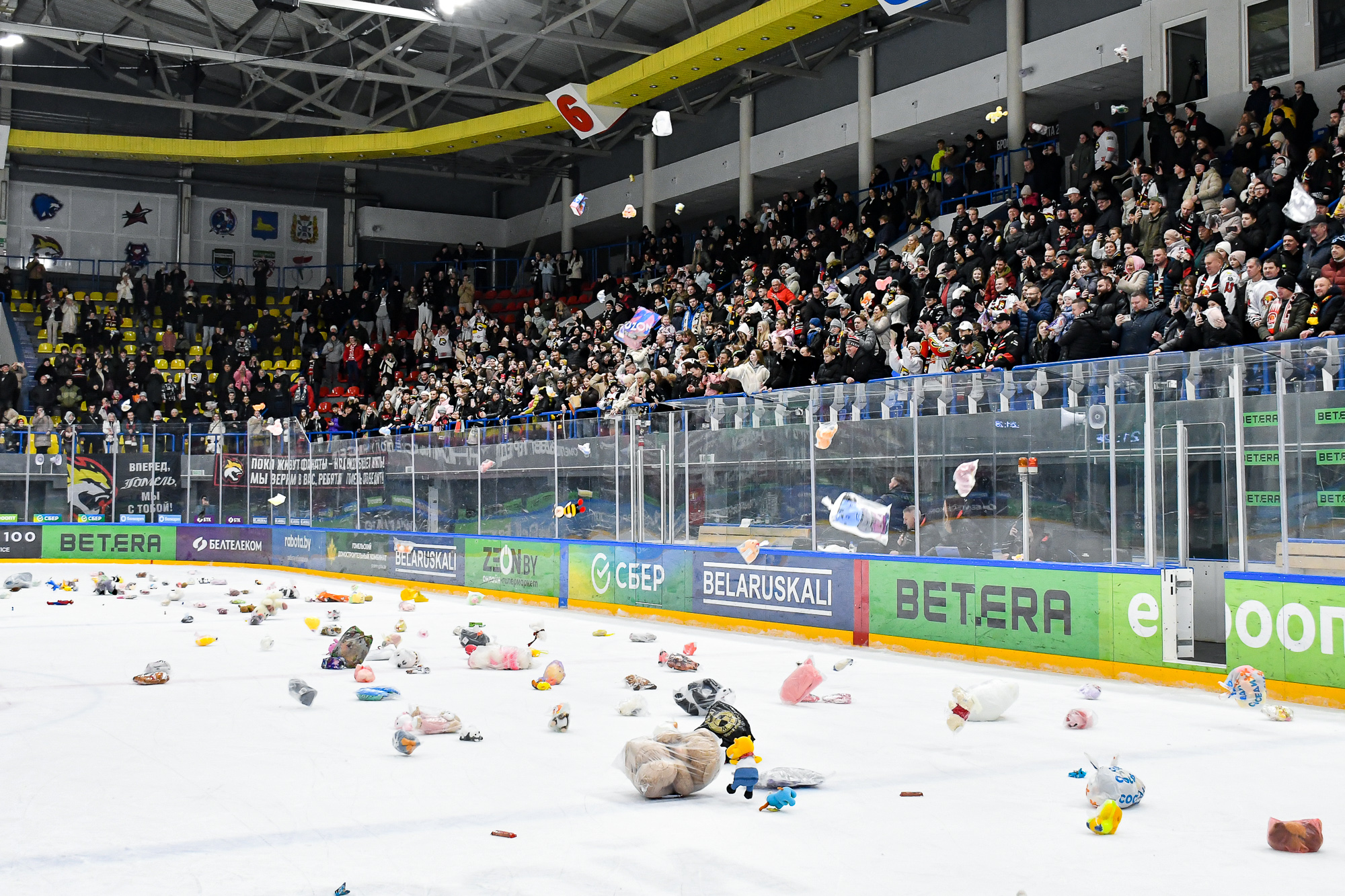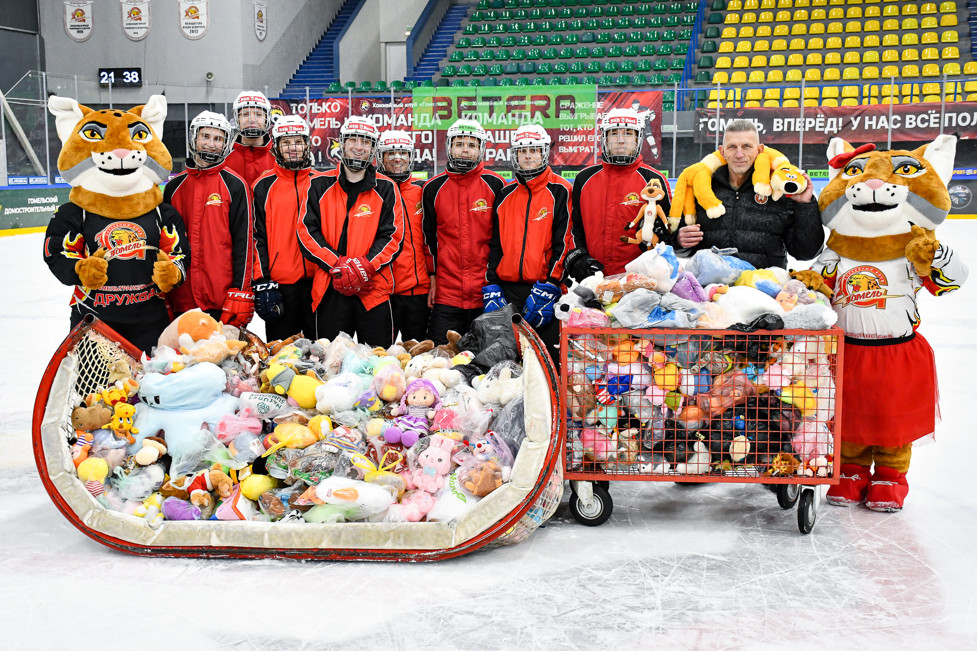 Каждый желающий, пришедший на трибуны, мог принести с собой на игру неограниченное количество мягких игрушек – от самых маленьких до самых больших. И после окончания матча по сигналу ведущего мягкие игрушки полетели на лед. К слову, вчерашний матч посетило 2500 болельщиков.