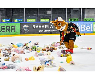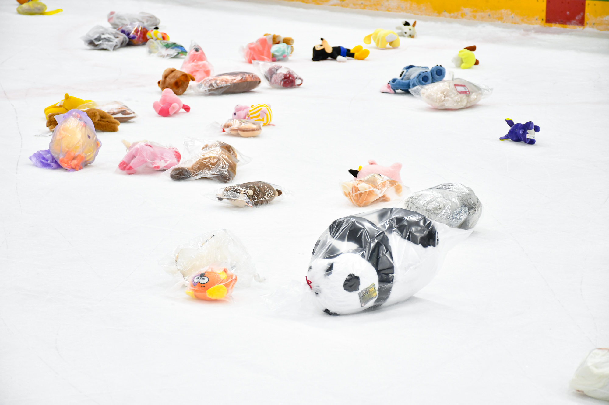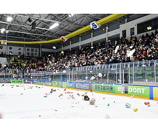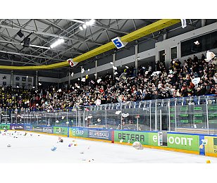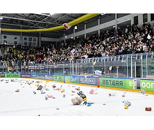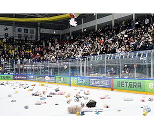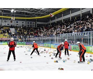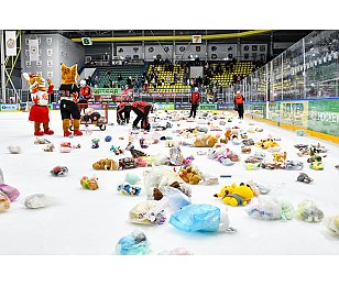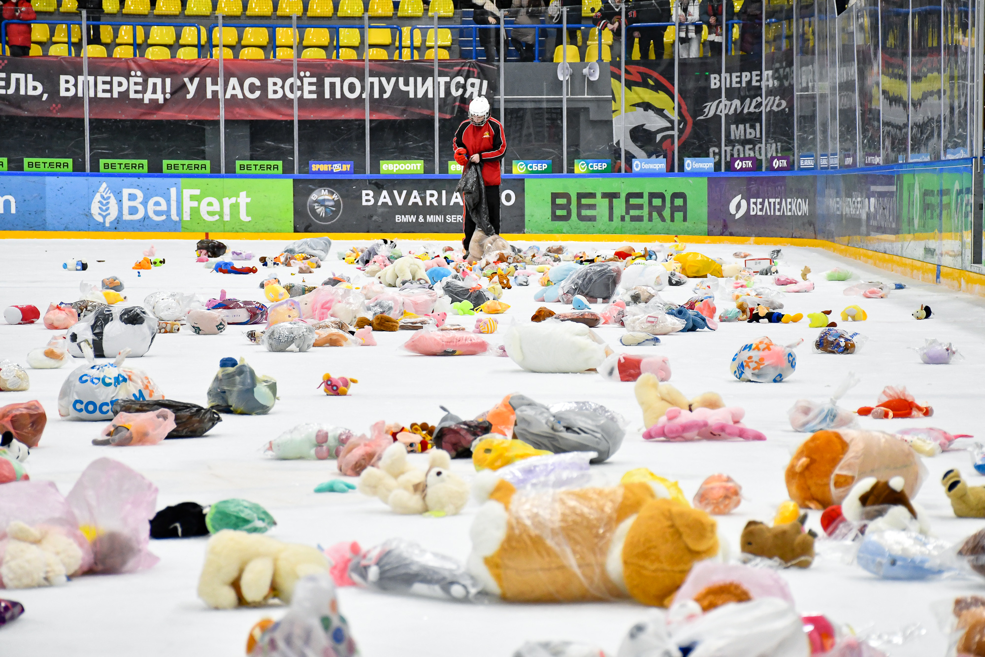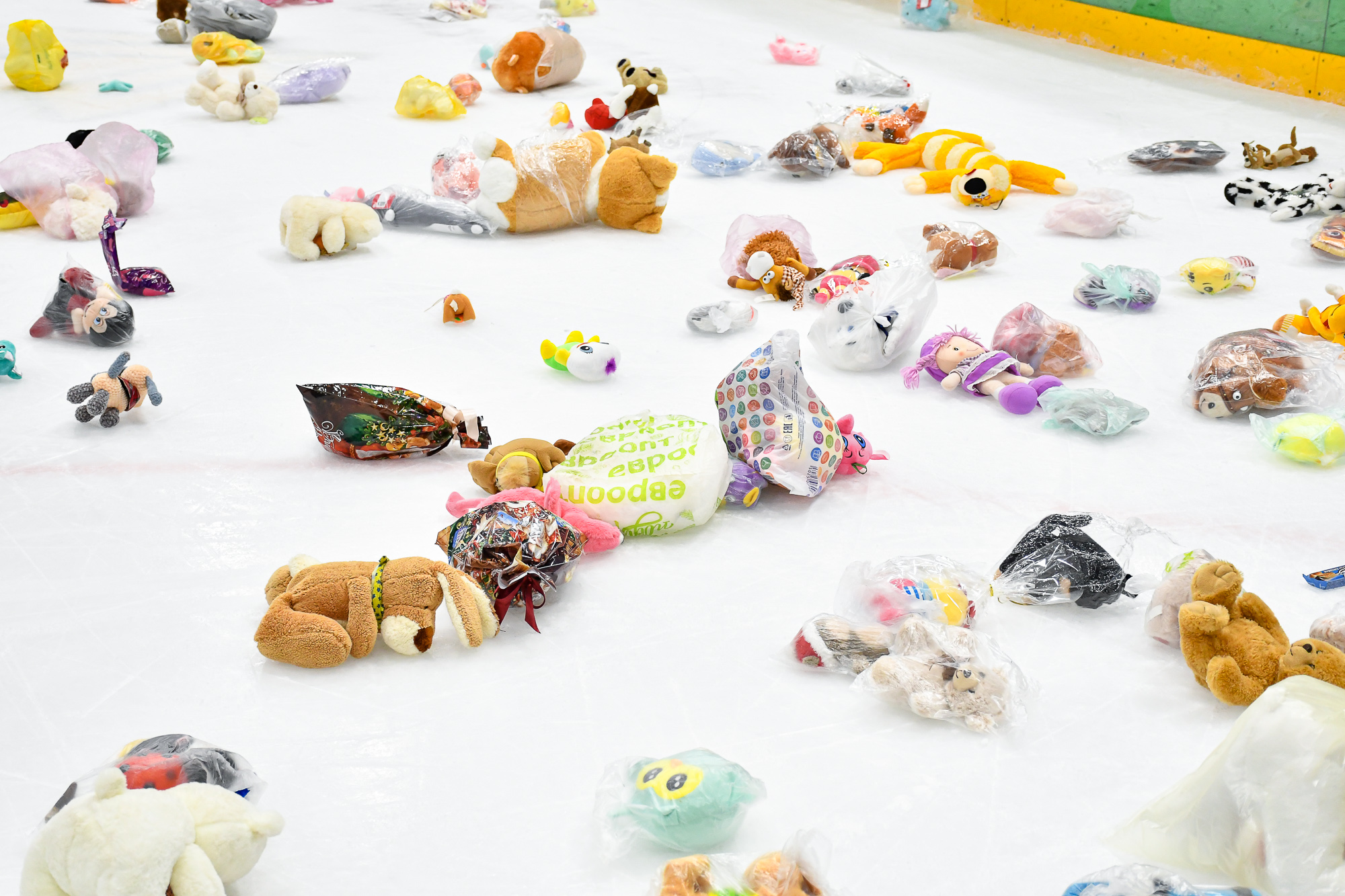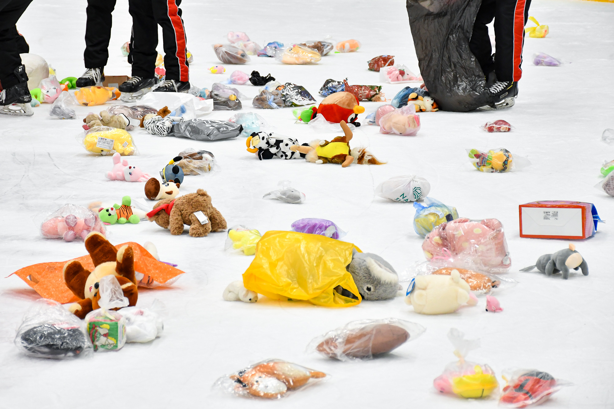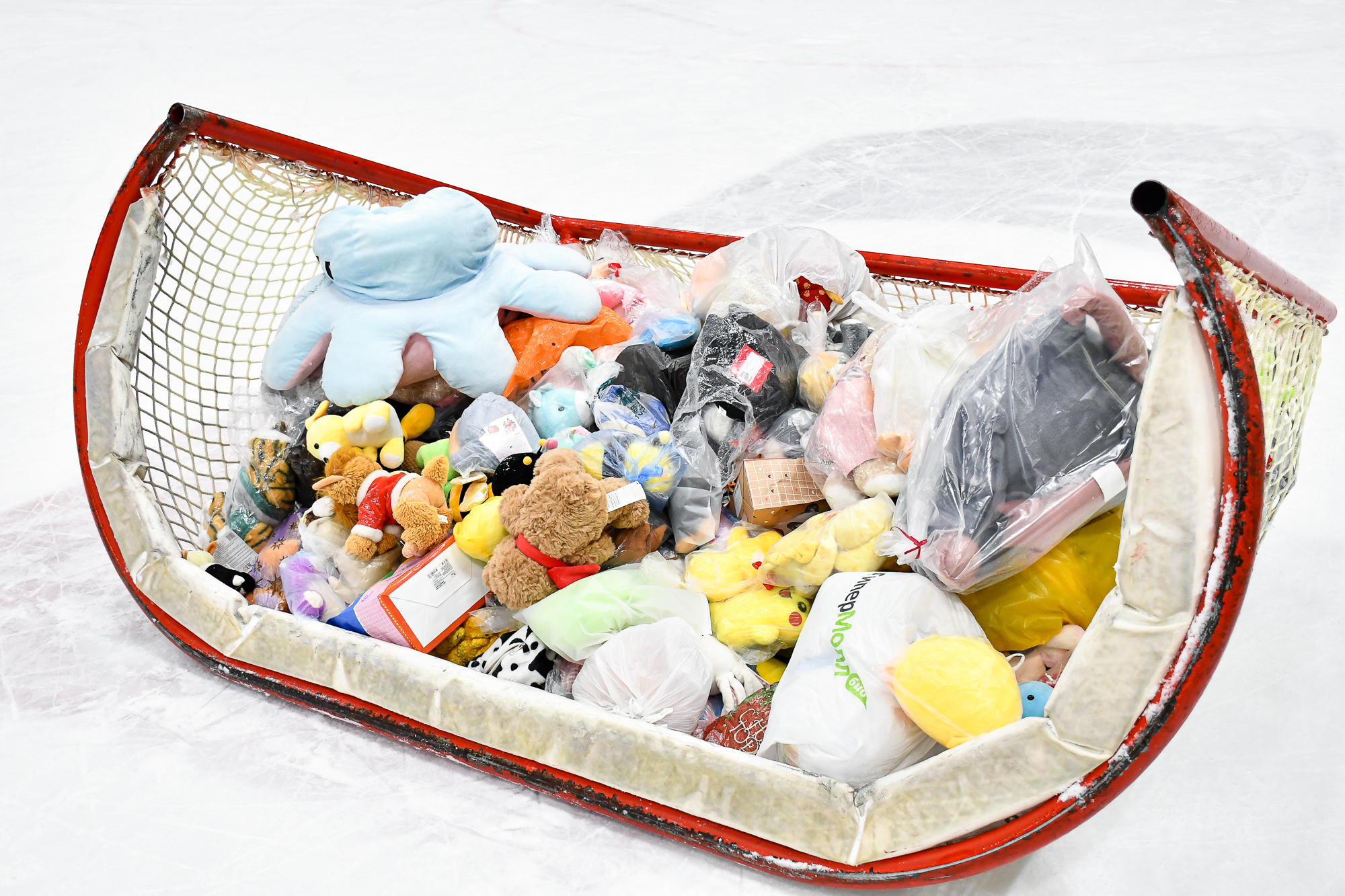 Каждый желающий, пришедший на трибуны, мог принести с собой на игру неограниченное количество мягких игрушек – от самых маленьких до самых больших. И после окончания матча по сигналу ведущего мягкие игрушки полетели на лед. К слову, вчерашний матч посетило 2500 болельщиков.
