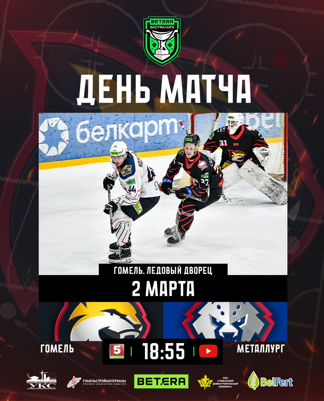 Игра стартует в 18:55, прямую трансляцию смотрите на телеканале «Беларусь 5» и YouTube-канале «Хоккей Беларуси | Экстралига».