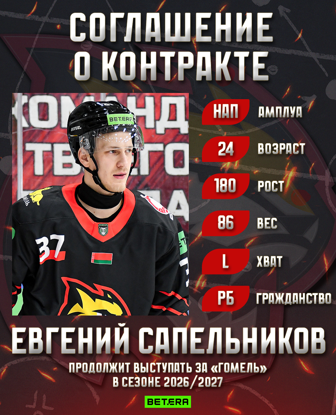 Нападающий Евгений Сапельников (2002) продолжит выступать за «Гомель» в сезоне 2026/27, с игроком достигнуто соглашение о подписании контракта.
